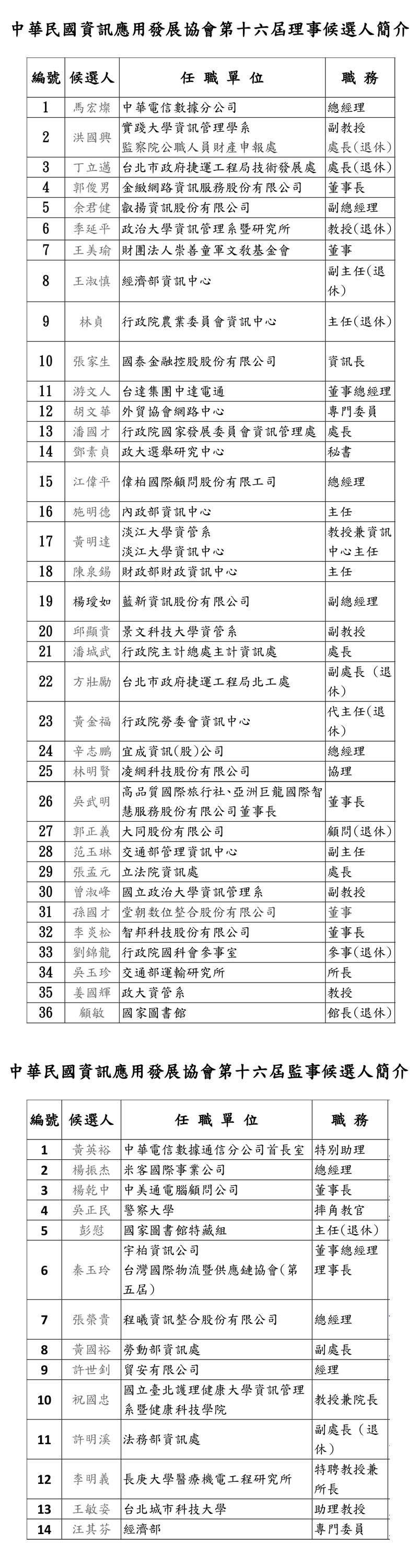 【ITMA】中華民國資訊應用發展協會 會員大會 第十六屆理監事選舉之【理事候選人簡介】及【監事候選人簡介】資料